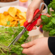 Saksien kahva sopii sekä oikeaan että vasempaan käteen.Terävät, ruostumattomasta teräksestä valmistetut terät ovat erittäin kestäviä ja ne leikkaavat useimpien materiaalien läpi.