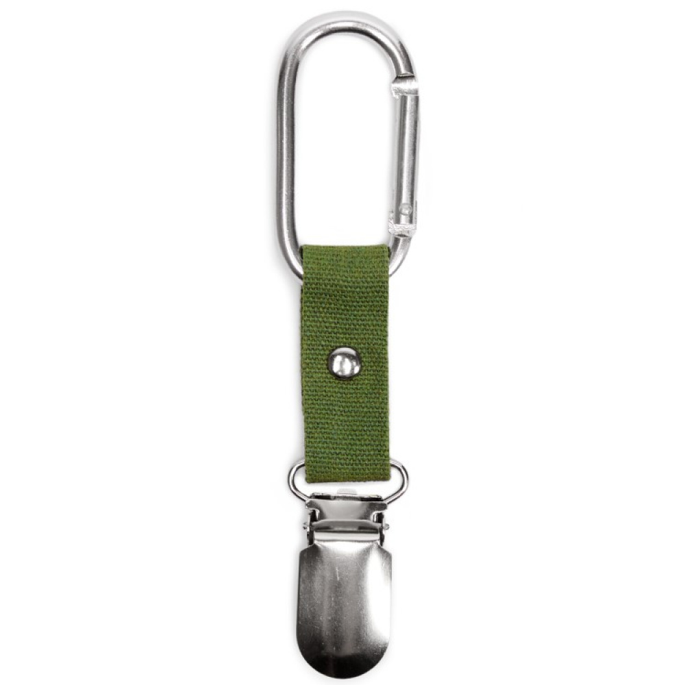Sen toisessa päässä on karabiinihaka ja toisessa klipsi. Voit kiinnittää hakasen esimerkiksi laukkuun, vaunuihin, reppuun tai vyöhön.