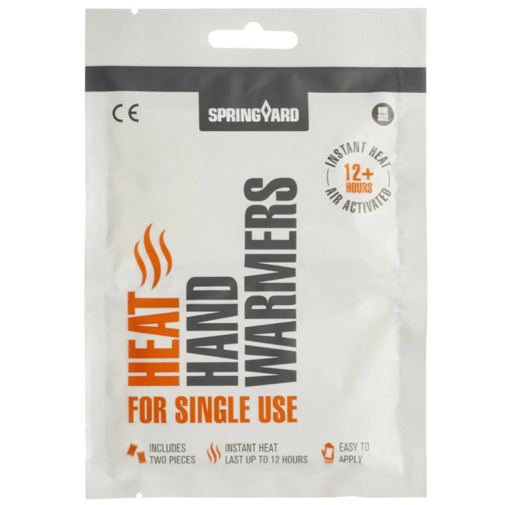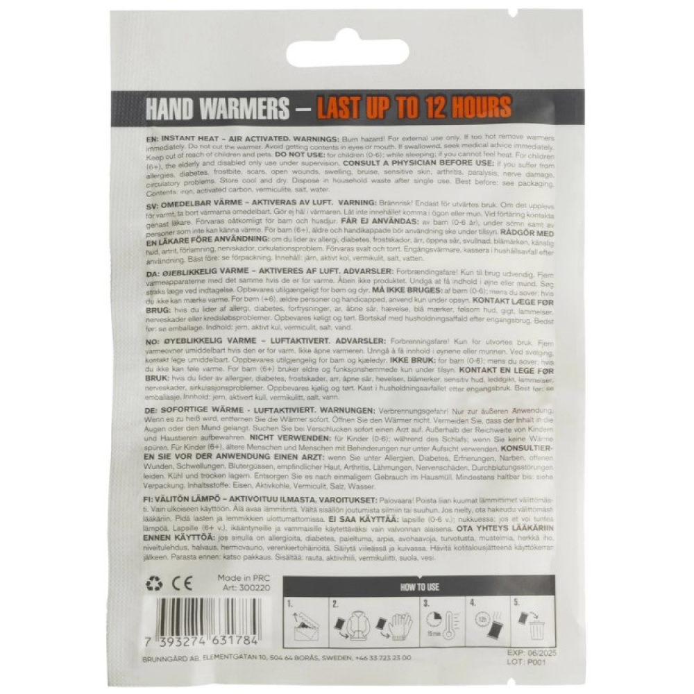 Avaa pussi aktivoidaksesi lämmittimet. Ne aktivoituvat heti, kun ne joutuvat kosketuksiin hapen kanssa ja muodostavat sitten luonnollisesti lämpöä muutaman minuutin kuluessa. Käsienlämmittimet pitävät keskilämpötilan noin 55 °C astetta ja ne pysyvät lämpiminä jopa 12 tunnin ajan.Lämmittimet ovat kertakäyttöisiä ja ne lajitellaan sekajätteeseen.