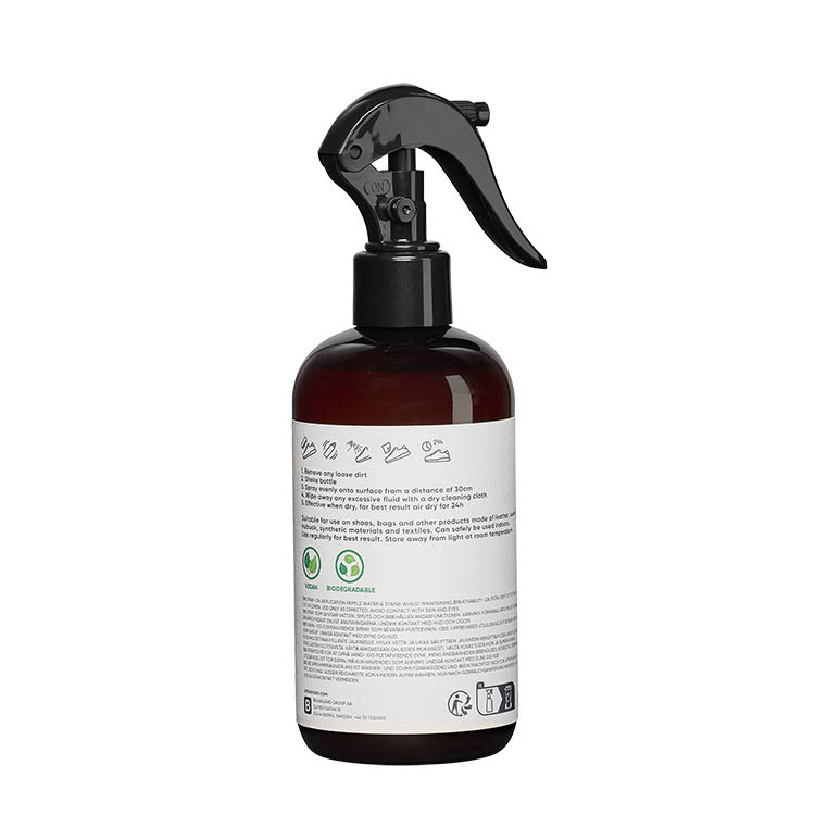 Tämä impregnointisuihke tarjoaa tehokasta suojaa kengille, vaatteille ja muille tekstiileille. Se toimii useilla eri materiaaleilla, nahasta ja mokasta synteettisiin ja Gore-Texiin, ilman että se heikentää materiaalin hengittävyyskykyä. Vedenpohjainen kaava on lisäksi ympäristöystävällinen ja OEKO-TEX-sertifioitu. Samalla suihke jättää jälkeensä hellävaraisen ja luonnollisen tuoksun.