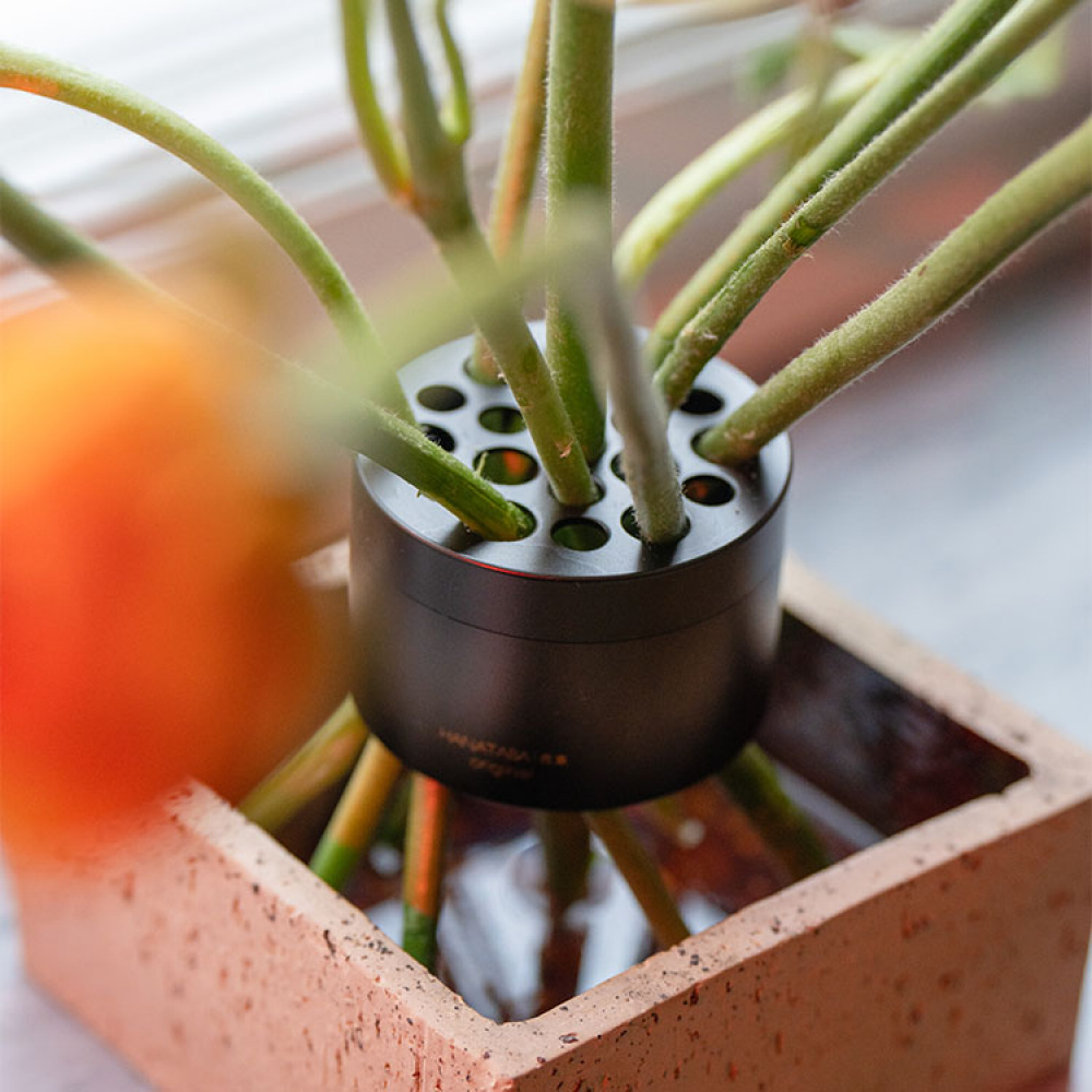 Siemenestä menestyksekkääseen kukintaan. Christian Jonasson juurrutti ideansa ruotsalaiseen maaperään ja on sittemmin nähnyt sen pyörivän kukkamaailmassa juurista kruunuun. Hanataba on kukkakimppupidike, jonka avulla voimme luoda kierteisiä kukka-asetelmia, joiden tilavuus on vaikuttava.