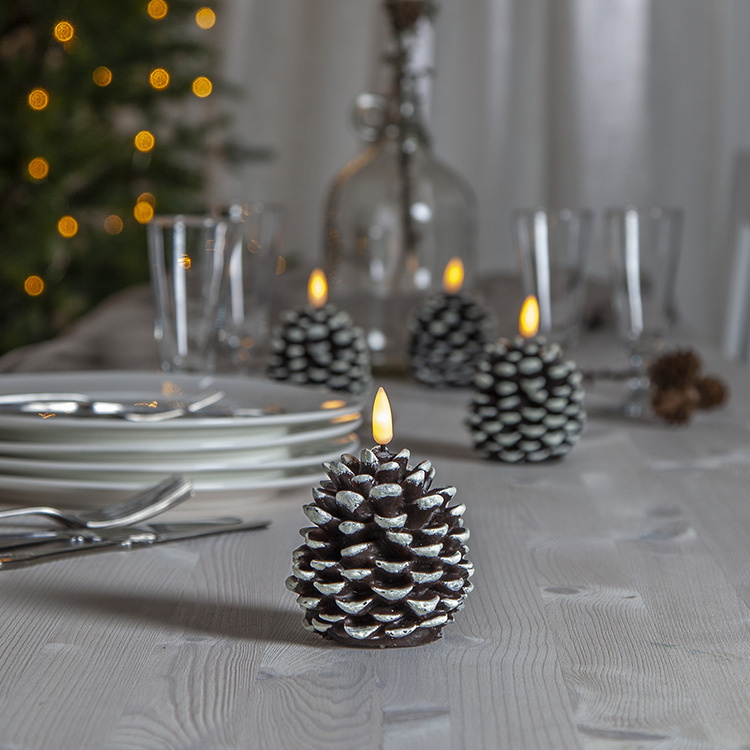 Tässä ihastuttavassa koristekävyssä on lumen peittämät suomut ja todenmukainen liekki, joka hehkuu lämpimän valkoista valoa. Ruskeanvalkoinen vahakävy sopii erinomaisesti sisätilojen koristeluun, ja se näyttää upealta pöydällä, ikkunassa tai kirjahyllyssä.