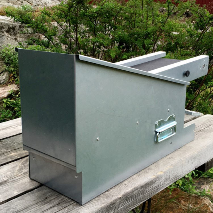 Materiaali: Korroosionkestävä Magnelis-pelti, lateksi/polyesteri hihnaMarjanpuhdistin, kasaan koottuna: pituus 920 cm, leveys 190 cm, korkeus 310 cm.