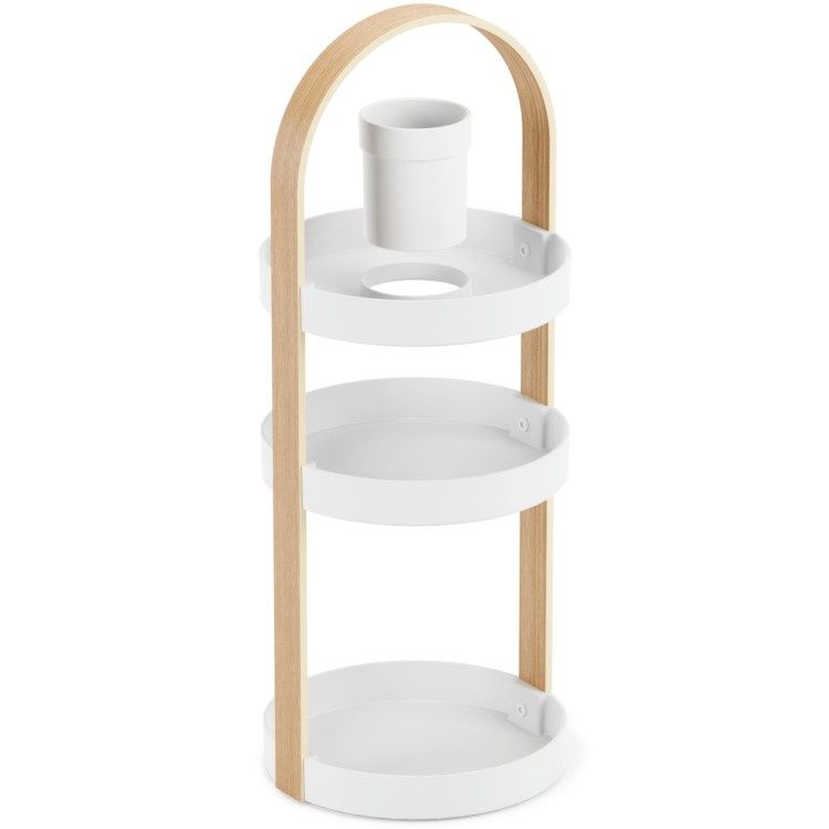 Umbran meikkiteline on monipuolinen säilytysratkaisu, joka sopii täydellisesti purkkien, voiteiden ja meikin säilyttämiseen kylpyhuoneessa. Telineessä on puinen runko, kolme hyllyä ja irrotettava muki siveltimille.