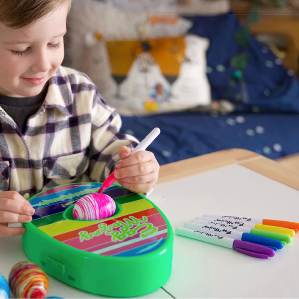 Eggmazing Mini vie koristelun uudelle tasolle ainutlaatuisen pyöritystoiminnon ansiosta. Aseta kananmuna koneeseen, käynnistä pyöritys ja koristele kynällä. Värikkäät kuviot alkavat muotoutua hetkessä. Munateline on hauska ja tarpeeksi yksinkertainen lasten käytettäväksi.Värikkäät kynät