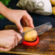 Muotin kaksi piikkiä pitävät perunan paikoillaan, minkä ansiosta leikkuri on tukeva ja vakaa käyttää. Muotin reunat on suunniteltu niin, ettei viiltoja vahingossa leikkaa liian syviksi. Näin perunat pysyvät kokonaisina kypsentämisen ajan.