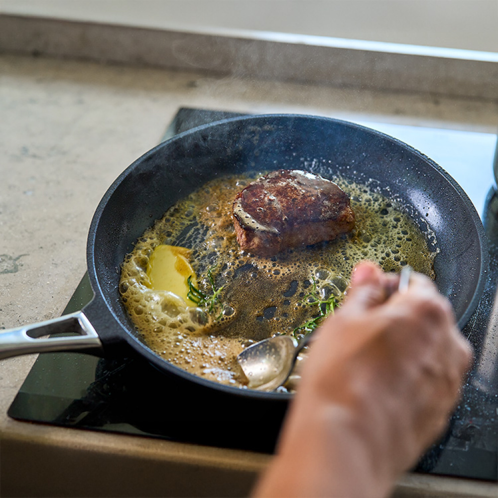 Ruostumattomasta teräksestä valmistettu kahva on tyylikäs ja toiminnallinen. Se tarjoaa vakaan otteen ja kestää korkeita lämpötiloja, joten pannua voi käyttää uunissa jopa 280 °C. Ihanteellinen ruoille, jotka vaativat sekä paistamista että gratinointia.Sopii kaikille liesityypeille