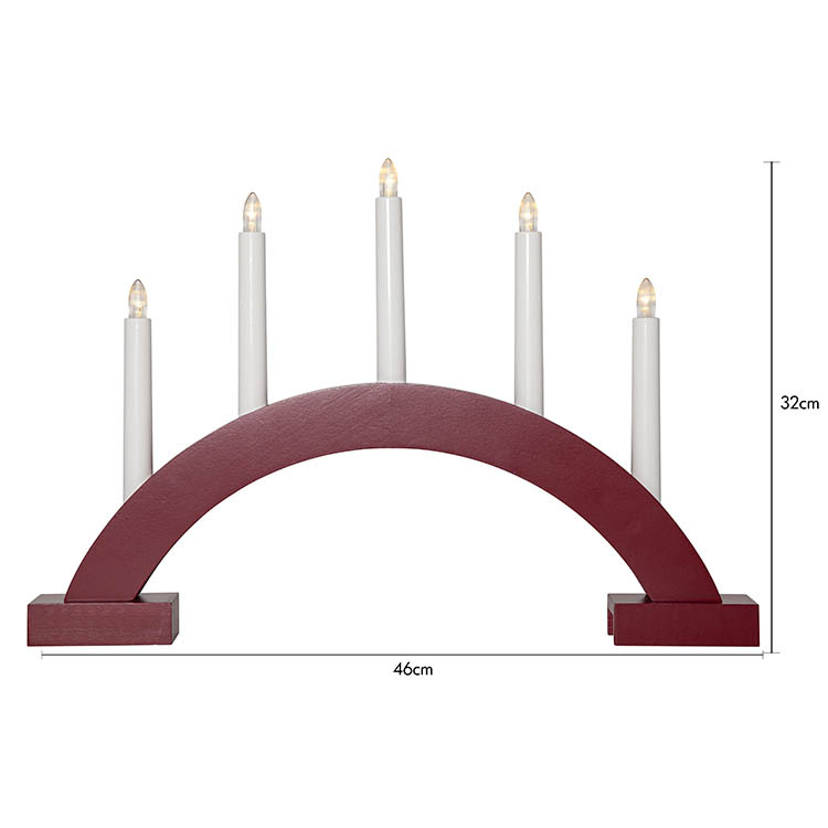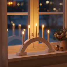 Kaareva adventtikynttelikkö puusta klassisella muotoilulla. Viisi LED-lamppua levittää lämpimän valkoista valoa, joka luo pehmeää ja tunnelmallista valoa. Kynttelikkö on paristokäyttöinen, mikä tekee siitä täydellisen ikkunoihin, hyllyille tai pöytäkoristeisiin tai muille paikoille, joissa sähköpistorasioita ei ole. Valmistettu FSC®-sertifioidusta puusta kestävästä metsätaloudesta.