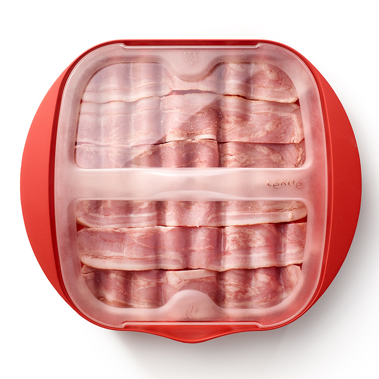Alustan pohjassa on uurteet, joita pitkin ylimääräinen rasva pääsee valumaan pois. Kansi suojelee mikroa rasvaroiskeilta. Kun pekoniviipaleet ovat valmiita, voidaan jäljelle jäänyt rasva kaataa pois reunassa olevan kourun kautta.