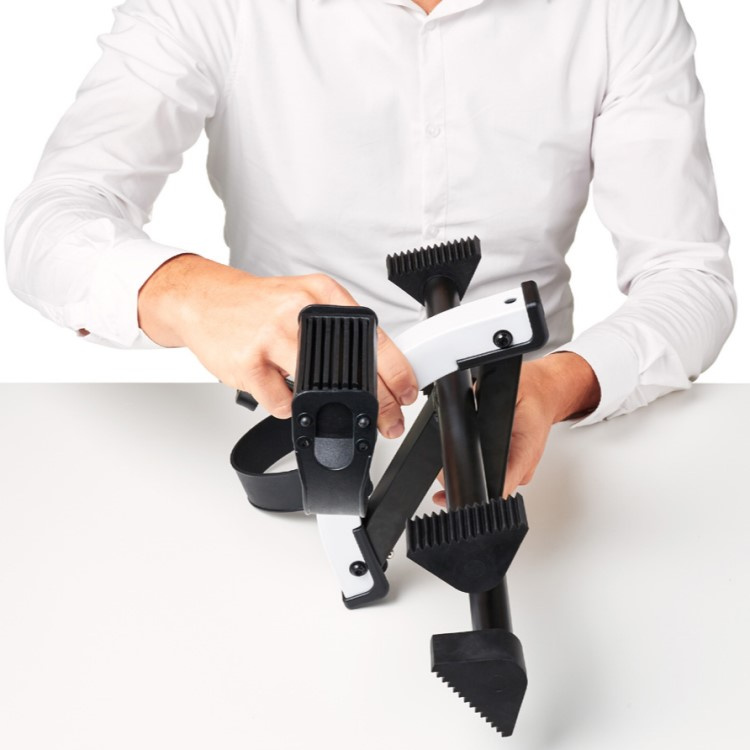 Tämä pieni polkulaite on helppo taittaa kokoon ja se vie vain vähän tilaa säilytyksessä. Paina jaloissa olevia hopeanvärisiä lukituspainikkeita jalkojen taittamiseksi sisään.