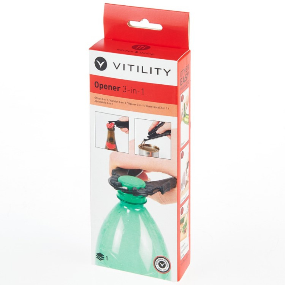 Ergonominen pullonavaaja, jonka kahvasta saa hyvän otteen. Avaajalla on helppo avata PET-pullojen kierrekorkit, ja sen takapuolella oleva työkalu sopii tölkinkansien tai muovi- ja lasipullojen avaamiseen.