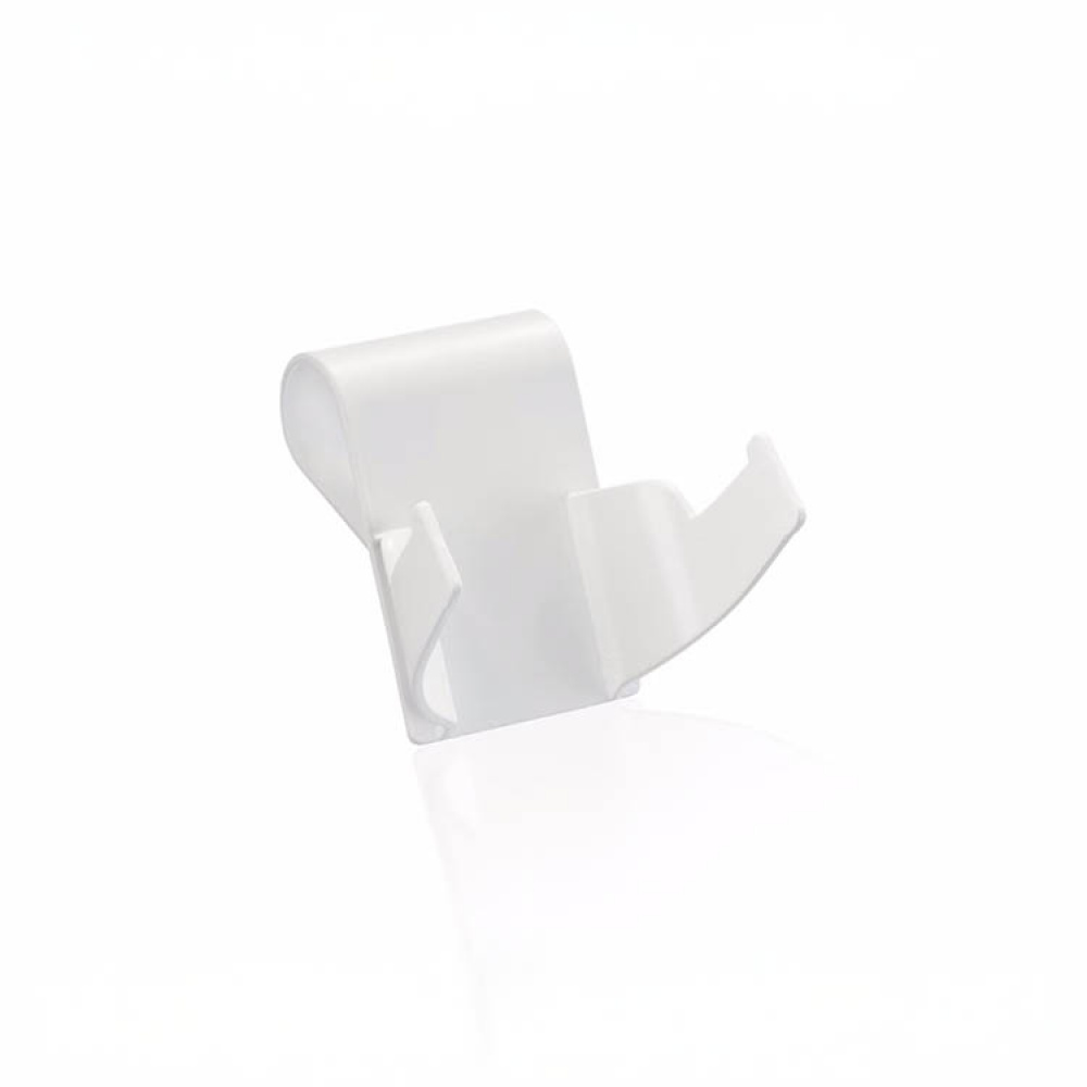 Hängfäste Leifheitin sähköiselle kaapimelle. Laite on suunniteltu helposti asennettavaksi, sillä sen kiinnitysmekanismin voi kiinnittää suihkuseinään, kylpyhuoneen kaappiin tai seinään ilman porausta. Kahvassa on hillitty, valkoinen muotoilu, joka sulautuu mihin tahansa kylpyhuoneeseen.