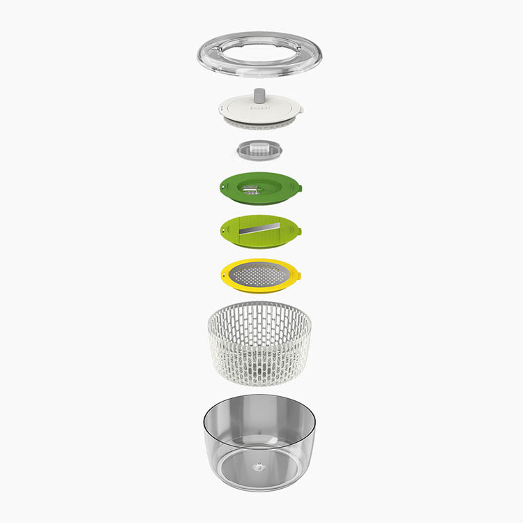 Joseph Josephin salaattilinko, jossa on raastin, spiraalileikkuri ja viipalointiosa. Liukumaton pohja takaa, että se pysyy tukevasti paikallaan käytön aikana. Kun kaikki on valmista, kaikki saa pinottua siististi salaattikulhoon, jolloin se on helppo ja kompakti säilyttää. Mukana toimitetaan sormisuojat viipalointiosan ja spiraalileikkurin käyttöä varten.