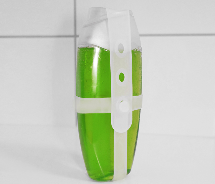Kätevä tapa säilyttää ja kuljettaa shampoopulloja.