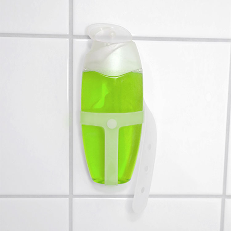 BathBuddy shampoopidikkeen avulla shampoopullo ei vuoda laukkuun. Takana oleva imukuppi mahdollistaa pullon kiinnittämisen suihkuhuoneen seinään, jotta pulloa ei ole tarpeen säilyttää lattialla.