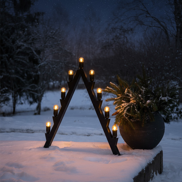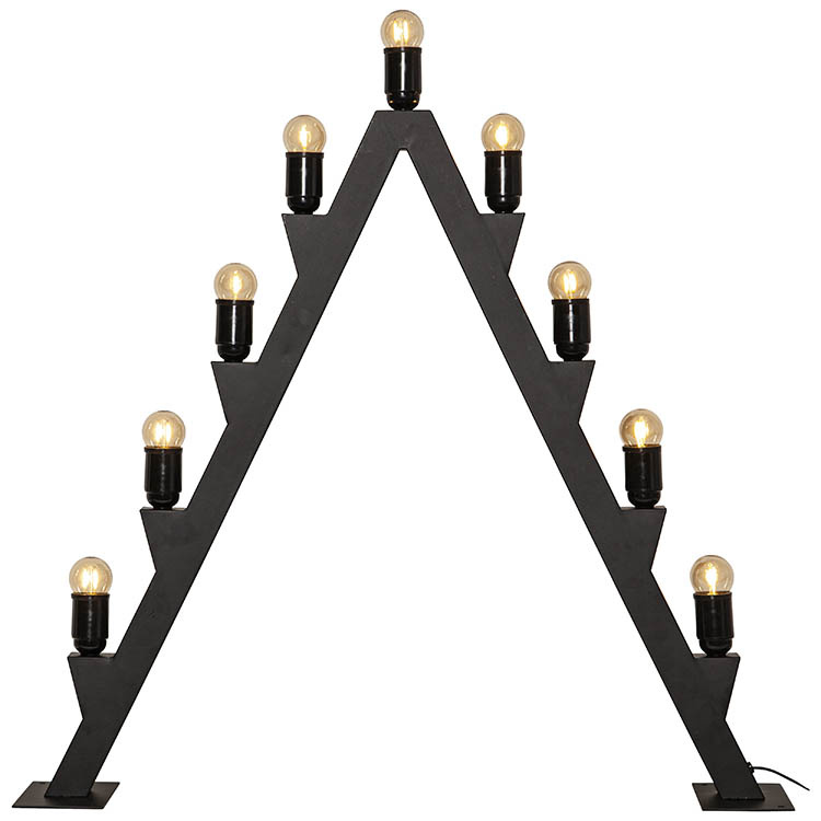Adventtikynttelikkö on valmistettu mustasta metallista, joka suurilla mitoillaan on selkeä katseenvangitsija, joka piristää talven pimeyttä. Se levittää lämmintä ja tervetuloa valoa, luoden kutsuvan tunnelman kodin ympärille vuoden pimeimpinä kuukausina. Kynttelikkö on IP44-luokiteltu, mikä tarkoittaa, että se soveltuu ulkokäyttöön. Mukana on yhdeksän valonlähdettä, joista jokainen on E27-kannan ja matala energiankulutus (0,23 W per lamppu). Valot toimivat matalajännitteellä (24V DC), mikä tekee rakenteesta sekä turvallisen että energiatehokkaan. Kokonaisvirrankulutus on vain 2,07 W.