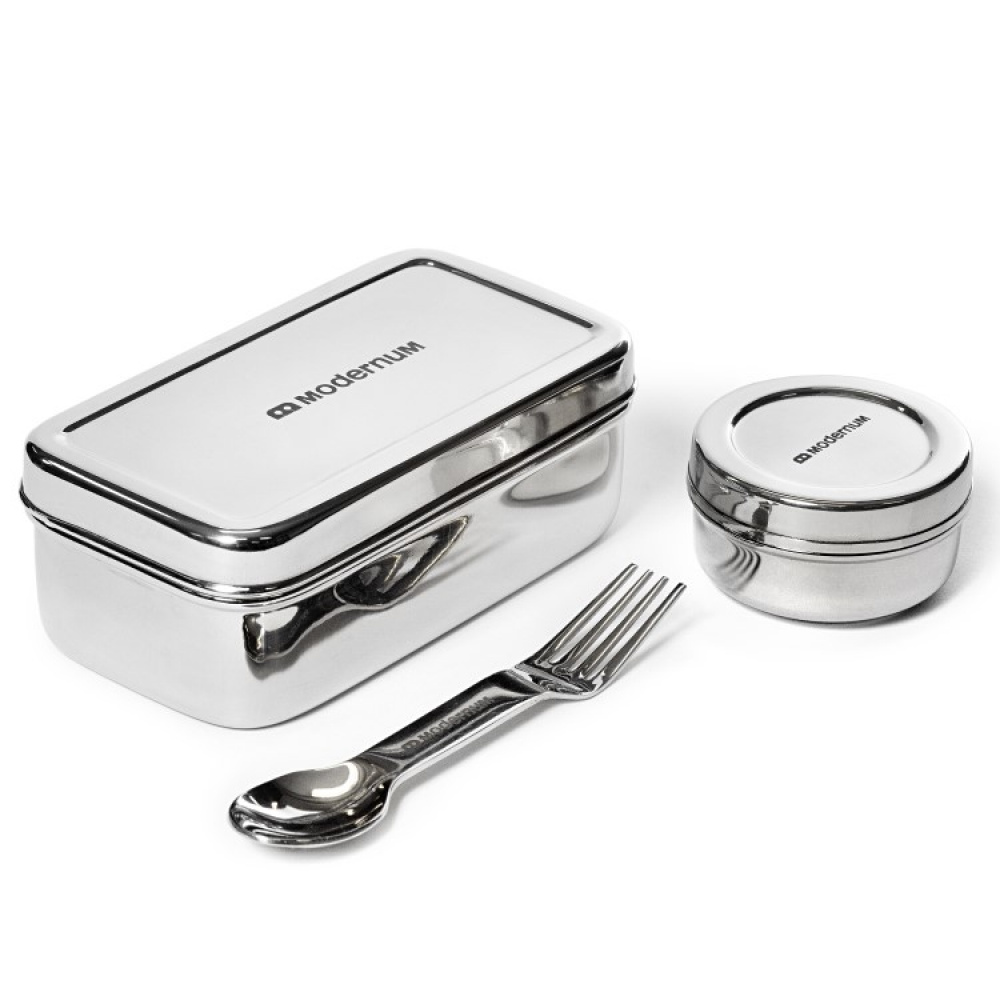 Modernumin valmistama kätevä ja tyylikäs eväsrasiasetti, joka on valmistettu ruostumattomasta teräksestä. Settiin kuuluu eväsrasia, välipalarasia sekä lusikkahaarukka spork.