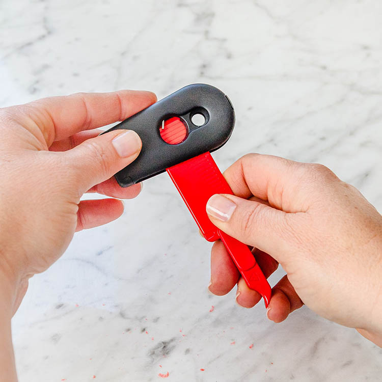 Monitoimikaapimen sisäänrakennettu teroitin teroittaa aina uudelleen yli 1 000 kertaa, mikä tarkoittaa, että kaapimen terä toimii jatkossakin parhaalla mahdollisella tavalla riippumatta siitä, kuinka paljon sitä käytetään.Puhdistaa vaikeapääsyiset alueet