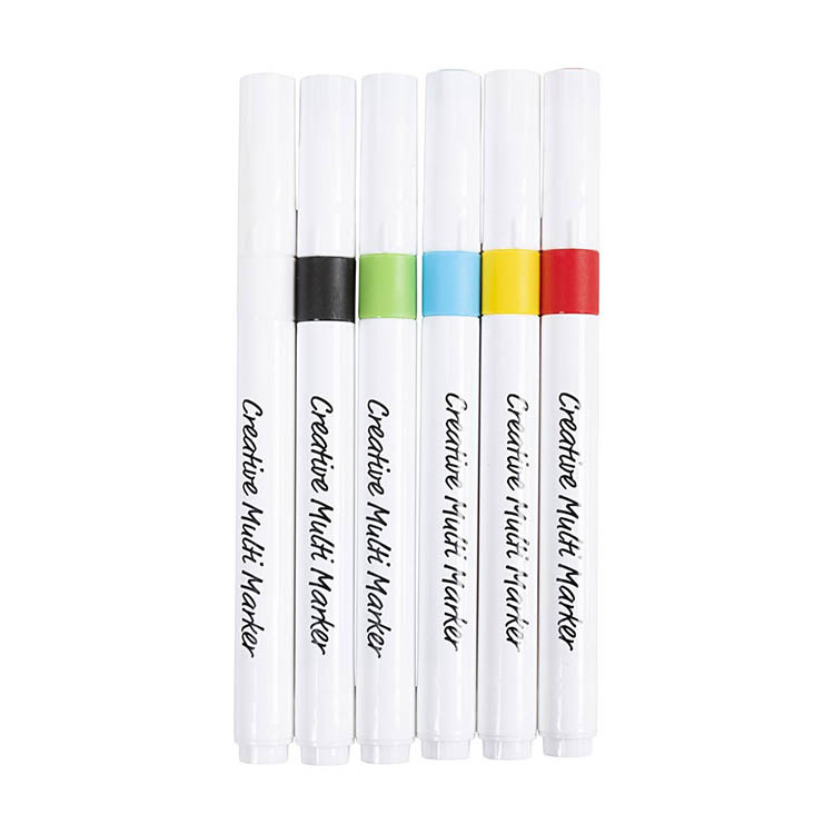 Vesipohjaiset tussit Creativ Companylta. Tyylikkäät värit ja vankat kuitupäät tekevät niistä helppokäyttöisiä, ja ne soveltuvat moneen eri pintaan – paperista ja kankaasta kiviin, puuhun, lasiin ja posliiniin. Koska värit eivät ole pysyviä, voit helposti pestä ne pois saippualla ja vedellä – täydellistä tilapäisiin kuvioihin tai leikkimieliseen luovuuteen.