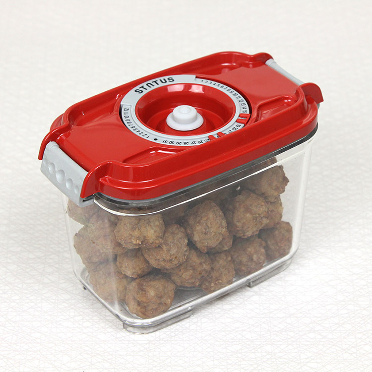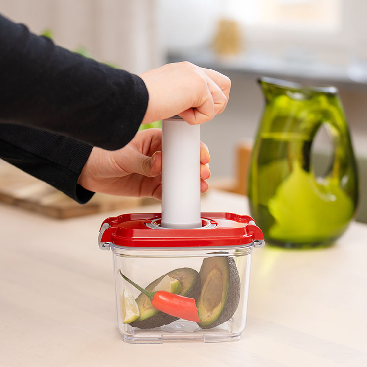 Läpinäkyvän rasian kannessa on käytännöllinen päivämäärämerkintä, jonka avulla sisällön pakkauspäivän voi tarkistaa. Kaikentyyppisiä ruokia, kastikkeita ja keittoja voidaan säilyttää tyhjiössä.