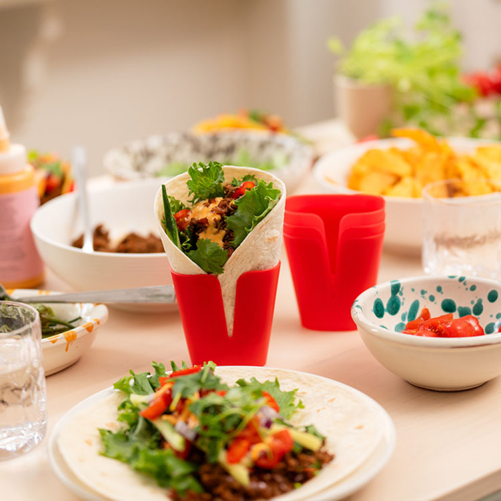 Jonas of Swedenin valmistaman wrap-pidikkeen avulla täytettyä wrapin voi asettaa pöydälle haukkausten ajaksi. Pidike helpottaa myös pehmeän leivän täyttämistä erilaisin herkuin.
